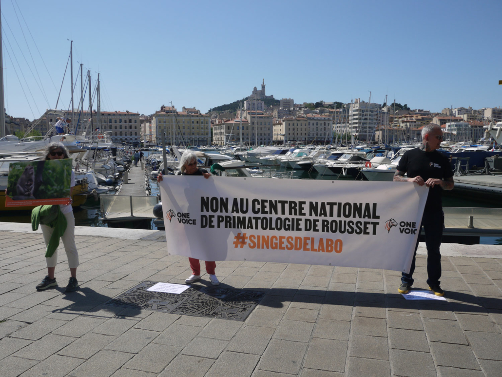 One Voice est une association de défense des animaux. Le samedi 25 avril, ses membres tenaient un stand sur le Vieux-Port de Marseille, pour alerter les passants sur l’agrandissement d’un élevage de primates destinés à la recherche en laboratoire, dans les Bouches-du-Rhône.