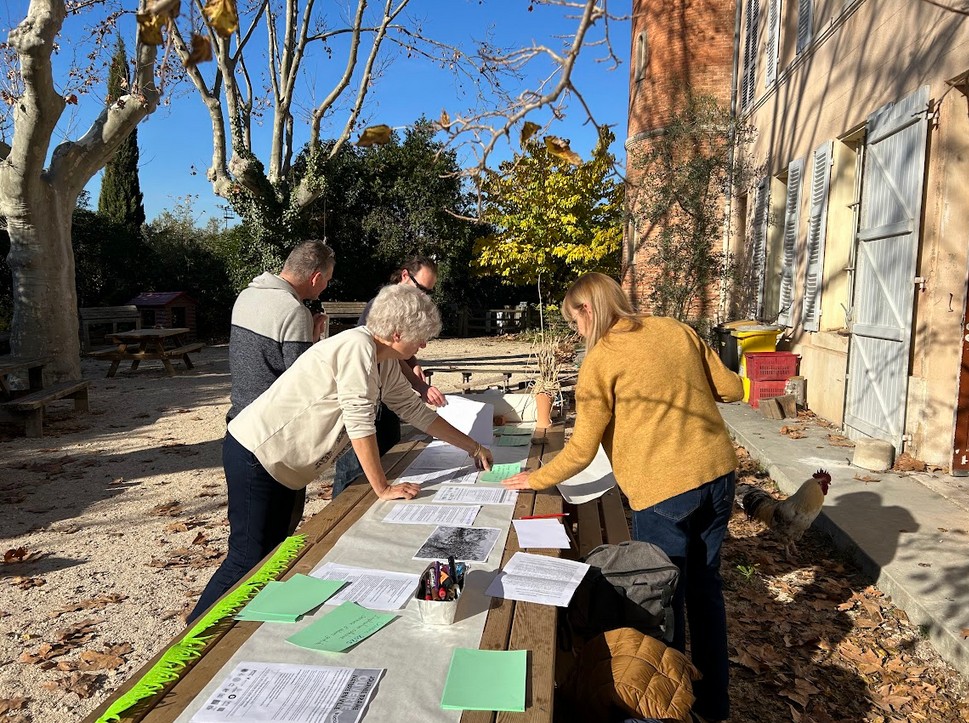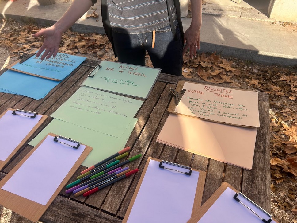 Les participants sont invités à noter leurs propositions afin de créer un argumentaire collectif. Les idées fusent : l’entretient des canaux d’irrigation, la restauration de murs en pierres sèches, l’organisation d’un ramassage de déchets sur le tracé de la trame verte, l’implication des collèges et des écoles pour créer une signalétique solide et durable dans le but de matérialiser la trame verte.